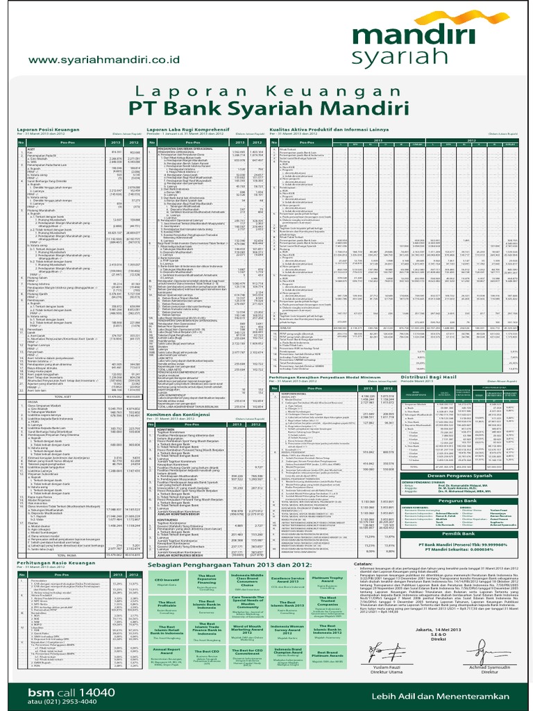 Laporan Keuangan Bank Syariah Mandiri 2013 - Download Laporan Audit 2017 315 MB download Laporan Audit 2016 1417 MB download Laporan Audit 2015 387 MB download Laporan Audit 2014 130 MB download Laporan Audit 2013 174 MB download Laporan Audit 2012 75979 KB. 6 pt bank syariah mandiri laporan laba rugi komprehensif untuk tahun yang berakhir pada tanggal 31 desember 2014 disajikan dalam rupiah penuh kecuali dinyatakan lain.