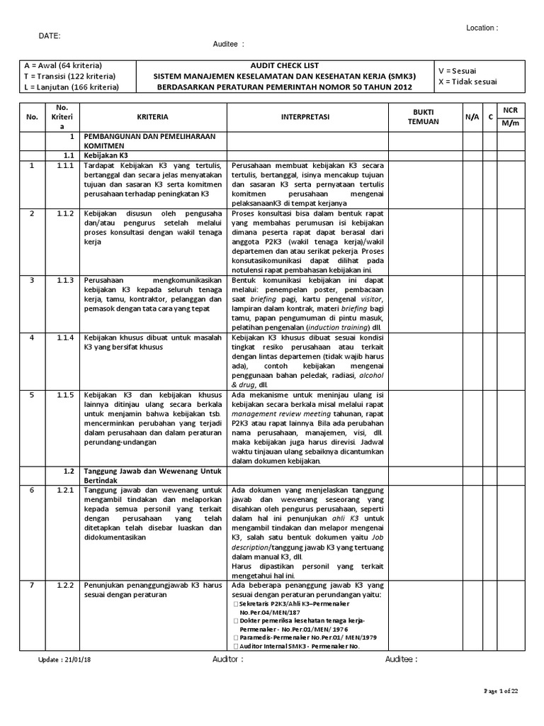 Checklist audit smk3 pp 50 tahun 2012 doc. Sistem Manajemen Keselamatan dan Kesehatan Kerja SMK3 adalah bagian dari sistem manajemen perusahaan secara keseluruhan dalam rangka pengendalian risiko yang berkaitan dengan kegiatan kerja guna terciptanya tempat kerja yang aman efisien dan produktif. Laporan pelaksanaan audit smk3 selama 3 tiga tahun terakhir. 112 Kebijakan disusun oleh pengusaha danatau pengurus setelah melalui proses.