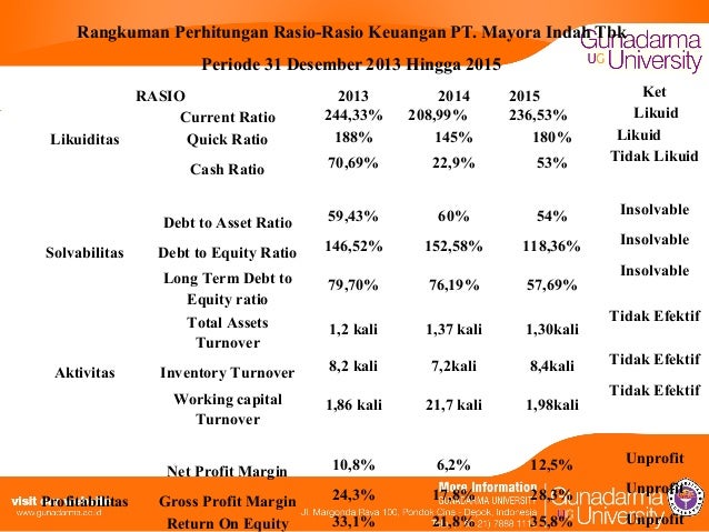 Laporan keuangan pt mayora indah tbk tahun 2014. Semakin tinggi rasio berarti semakin. Rasio kas PT Mayora Indah Tbk sebesar 018 kali ini artinya PT Mayora memiliki kas dan setara kas untuk membayar 18 kewajiban lancarnya. Serta untuk m enilai kondisi keuangan dan kinerja perusahaan dengan.