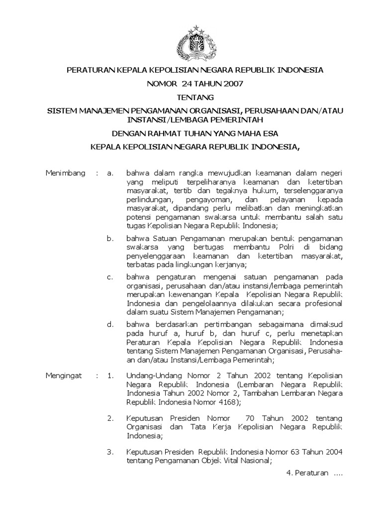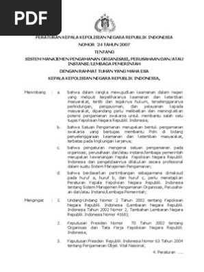 24 Tahun 2007 Tahun. Perkap no 1 tahun 2008 ttg pengawasan dan pemeriksaan umum serta perbendaharaan di polri. 24 tahun 2007 tentang Sistem Pengamanan Manajemen PerusahaanInstansi Pemerintahan Peraturan Kapolri NoPol.