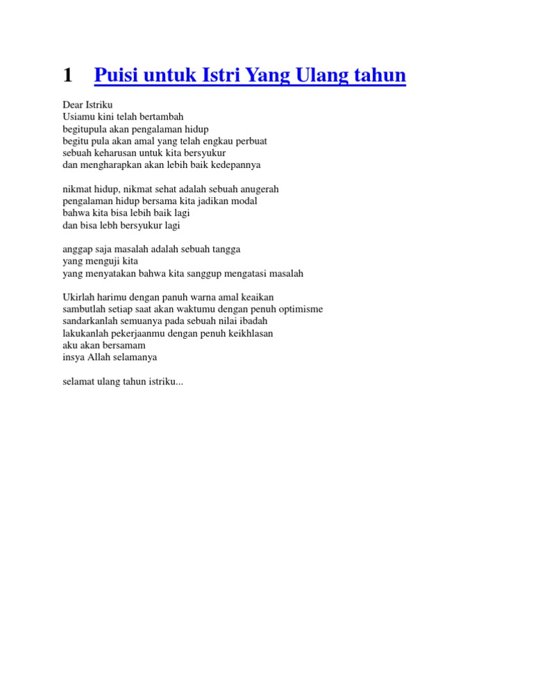 SEBUAH PUISI UNTUK ULANG TAHUN ISTRIKU. Ku tak punya kado istimewa untukmu tapi ku punya doa untukmu agat kau selalu mendapatkan perlindungan dari Tuhan Yang Maha Kuasa. Nah kalau kamu ingin memberi kebahagiaan kecil lewat sebuah ucapan ulang tahun untuk istri mu baca artikel ini sampai habis.