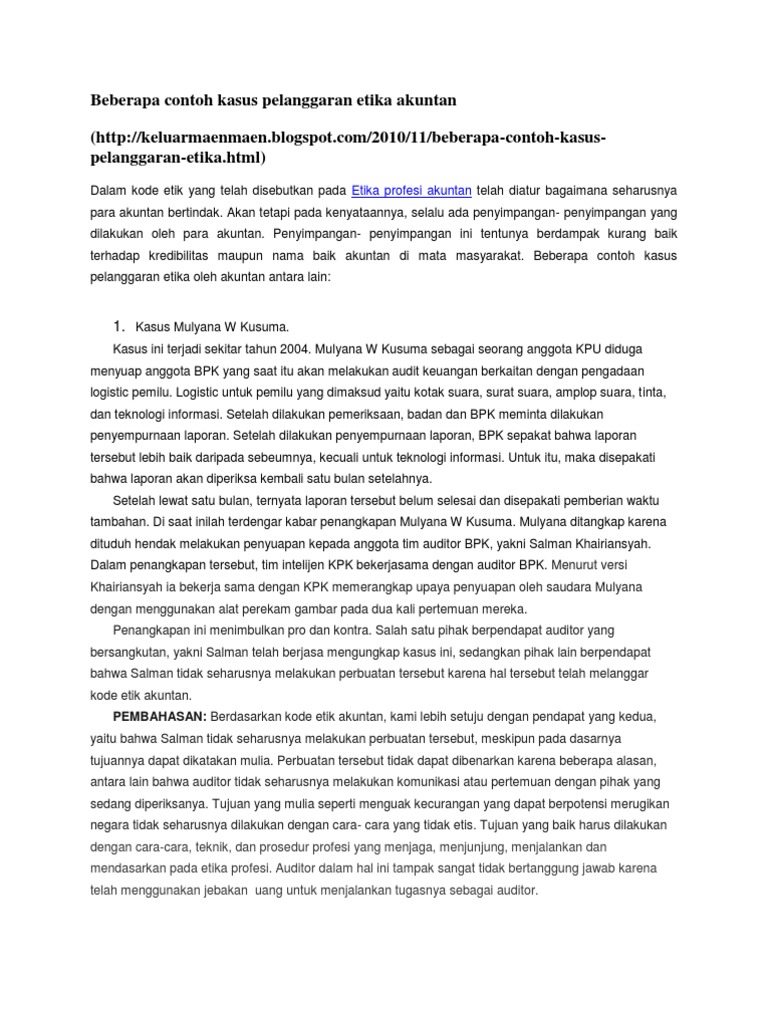 Pelanggaran kode etik akuntan. Faktor-Faktor yang Mempengaruhi Terjadinya Pelanggaran Kode Etik Akuntan Putri Ramadhayanti 15919056 putri_r93yahoocoid Semakin meluasnya kebutuhan jasa profesional akuntan publik sebagai pihak yang dianggap independen menuntut profesi akuntan publik untuk meningkatkan kinerjanya agar dapat menghasilkan produk audit yang dapat diandalkan bagi pihak yang membutuhkan. Kasus Pelanggaran Etika Profesi Akuntansi. Etika profesi dan tata kelola.