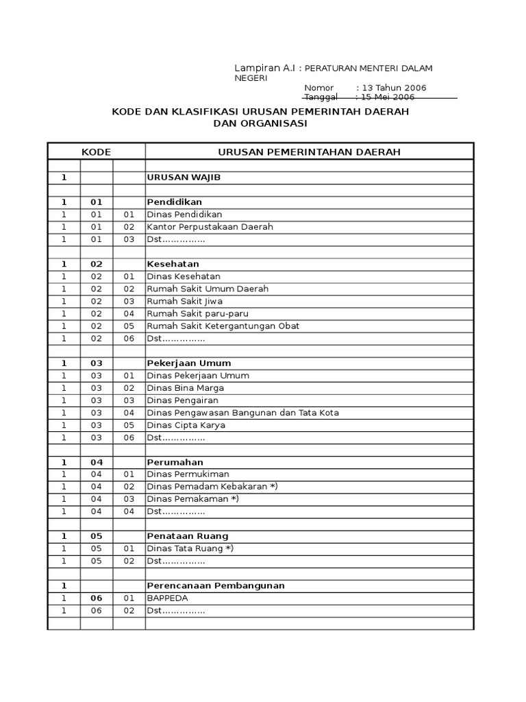15 Mei 2006 KODE DAN DAFTAR PROGRAM DAN KEGIATAN MENURUT URUSAN PEMERINTAHAN DAERAH KODE PROGRAM DAN KEGIATAN PROGRAM DAN KEGIATAN PADA SETIAP SKPD x xx xx 01 Program Pelayanan. Itulah informasi mengenai lampiran permendagri no 13 tahun 2006 lengkap yang dapat kami bagikan. Download Permendagri 13 Tahun 2006.