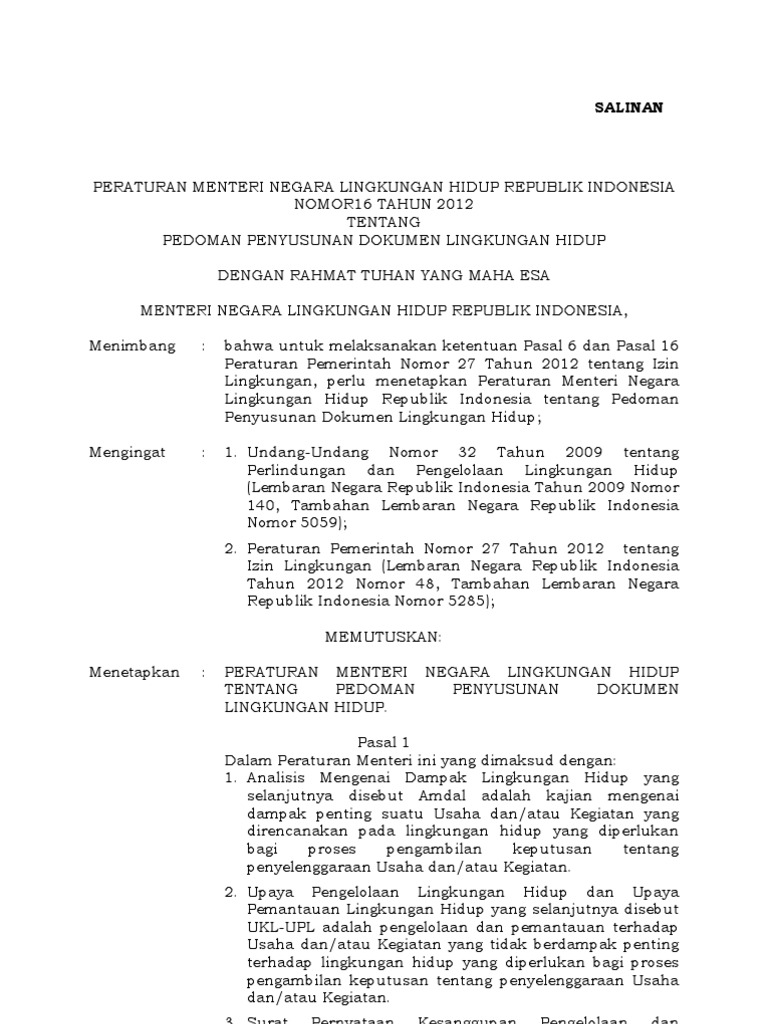 Permen lh 16 2012. Permen 16 th 2012 Pedoman Penyusunan Dokumen Lingkungan Hidup. Secara umum Pengertian AMDAL ini merupakan suatu kajian untuk mengetahui dampak lingkungan yang disebabkan oleh karena adanya sebuah kegiatan atau aktivitas yang direncanakan misalnya. NOMOR 16 TAHUN 2012 TENTANG PEDOMAN PENYUSUNAN DOKUMEN LINGKUNGAN HIDUP DENGAN RAHMAT TUHAN YANG MAHA ESA MENTERI NEGARA LINGKUNGAN HIDUP REPUBLIK INDONESIA Menimbang.