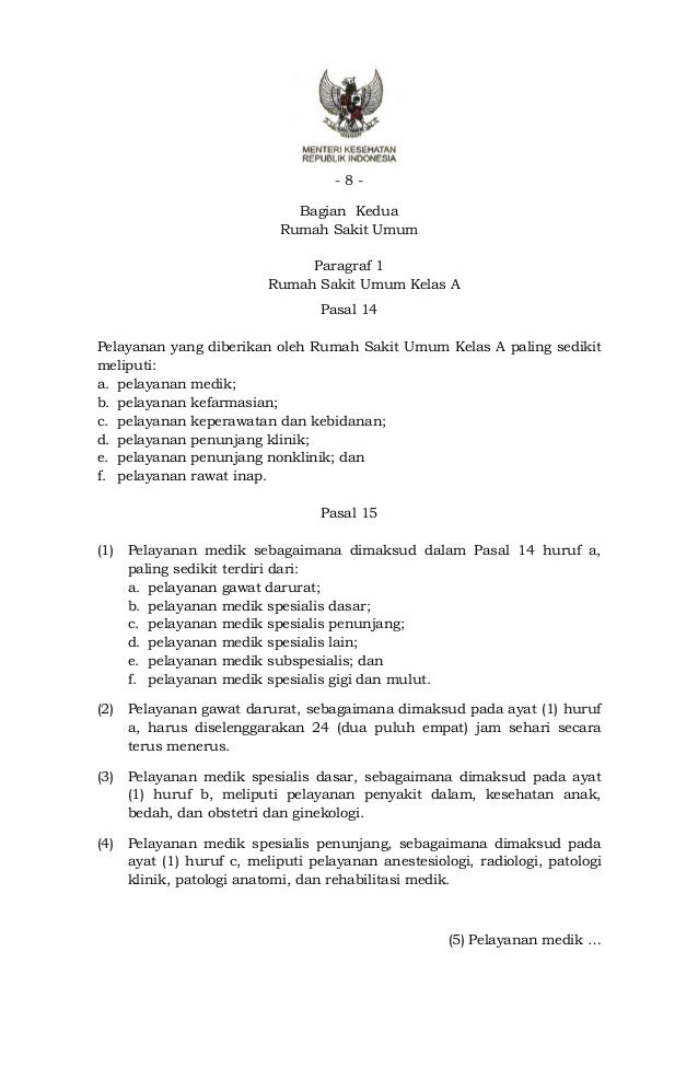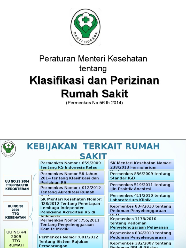 PERATURAN MENTERI KESEHATAN REPUBLIK INDONESIA NOMOR 56 TAHUN 2014 TENTANG KLASIFIKASI DAN PERIZINAN RUMAH SAKIT DENGAN RAHMAT TUHAN YANG MAHA ESA MENTERI KESEHATAN REPUBLIK INDONESIA Menimbang. Bahwa untuk meningkatkan mutu pelayanan rumah sakit perlu dilakukan penyempurnaan sistem perizinan dan klasifikasi rumah sakit sebagaimana diamanatkan oleh Undang-Undang Nomor 44 Tahun. Republik Indonesia 2009 Undang Undang Republik Indonesia Nomor 44 Tahun 2009 tentang Rumah Sakit Jakarta.