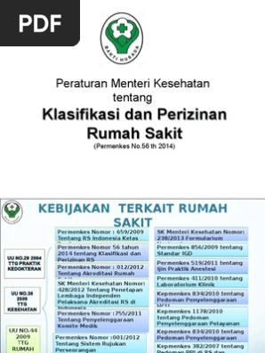 Republik Indonesia 2014a Peraturan Menteri Kesehatan Republik Indonesia Nomor 56 Tahun 2014 tentang Klasifikasi dan Perizinan Rumah Sakit Jakarta. 56 th 2014 ttg Klasifikasi dan Perizinan Rumah Sakitpdf. Maka wajib Bagi SEMUA praktisi kesehatan Harus memahami Peraturan Menteri kesehatan Nomor 56 Tahun 2014 tersebut agar Bisa menjalankan Pelayanan kesehatannya.