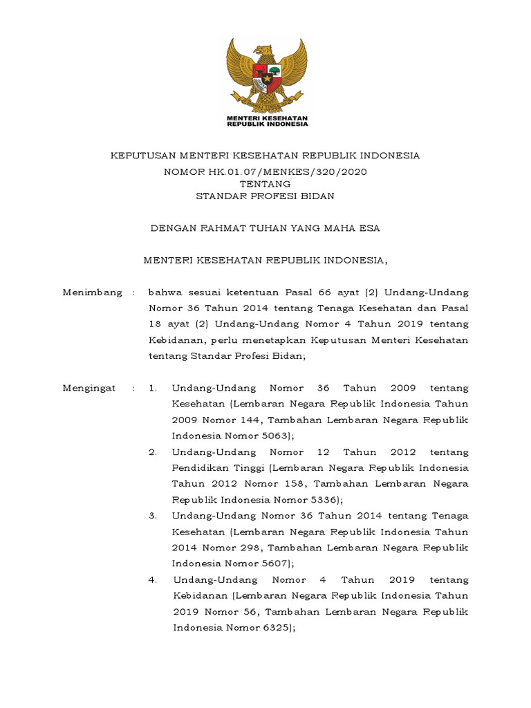 Kmk No Hk 01 07 Menkes 320 2020 Ttg Standar Profesi Bidan Pdf