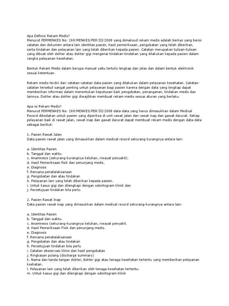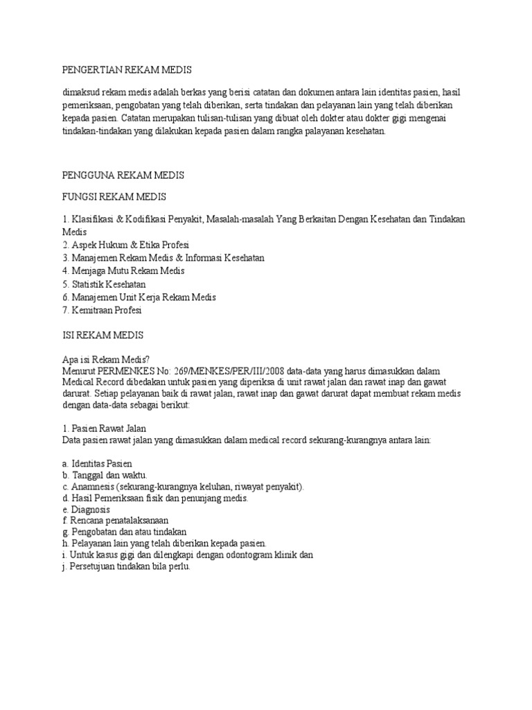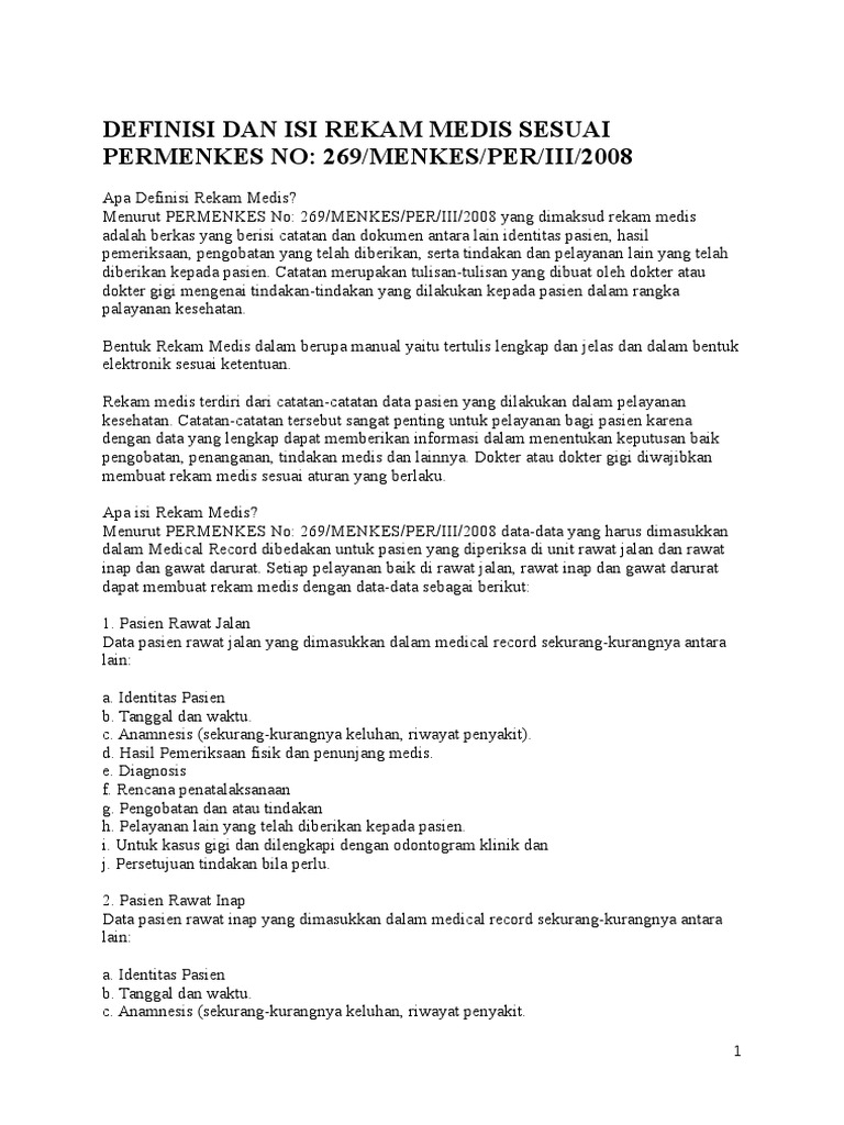 PERMENKES Nomor 269MENKESPERIII2008. Pengertian Rekam Medis Dalam penjelasan Pasal 46 ayat 1 UU Praktik Kedokteran yang dimaksud dengan rekam. PERMENKES 269MENKESPERIII2008 TENTANG REKAM MEDIS.