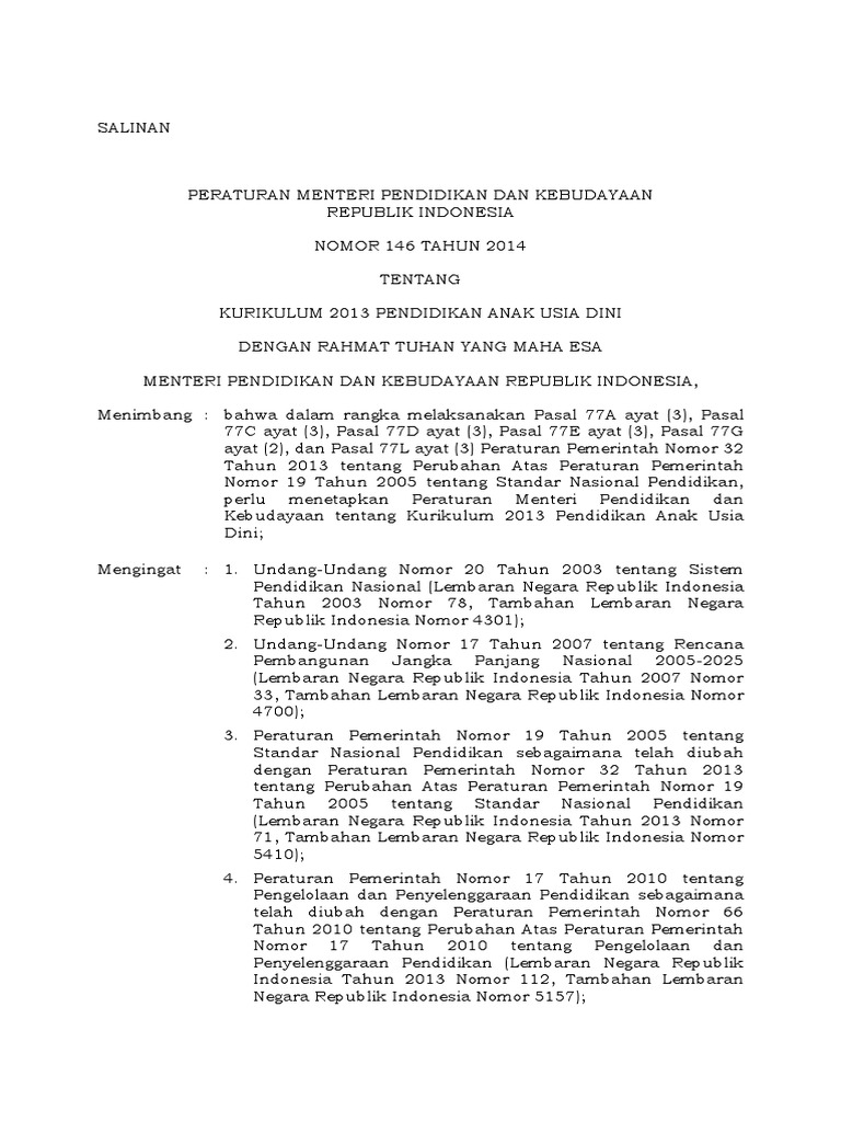 Permen 146 Tahun 2014 Paud - BAB I KETENTUAN UMUM Pasal 1 Dalam Peraturan Menteri ini yang dimaksud dengan. Menurut Permendikbud 146 Tahun 2014 tentang Kurikulum 2013 PAUD standar nasional PAUD menjadi acuan dalam pengembangan pelaksanaan dan evaluasi kurikulum mata kuliah PAUD.