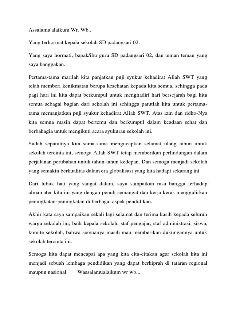Pidato ulang tahun sekolah sd smp sma adalah contoh teks naskah pidato pendidikan menggunakan bahasa indonesia. Selamat sore teman-teman yang saya sayangi. Teks pembawa acara ulang tahun sekolah.