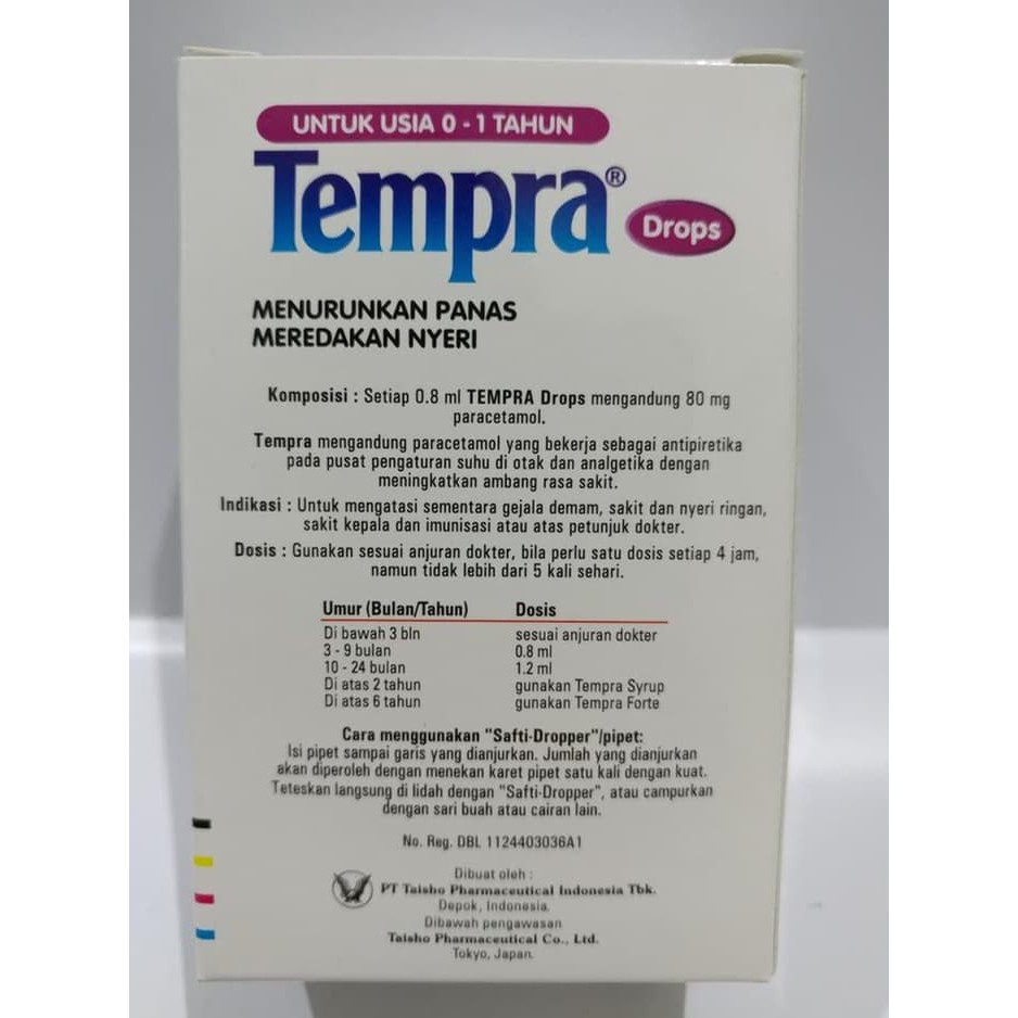 Anak usia 3 hingga 9 bulan. Kemudian tinggal lihat sediaan parasetamol yang kita punya. Tempra Drops mengandung paracetamol yang bekerja sebagai antipiretika pada pusat pengaturan suhu di otak dan analgetika dengan meningkatkan ambang rasa sakit.